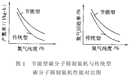 (2)節(jié)能型碳分子篩制氮機(jī)采用不等勢(shì)均壓流程,顯著提高了碳分子篩的產(chǎn)氮能力和回收率,減少了制氮能耗,可直接獲取 99.995%的高純氮?dú)?,填補(bǔ)了國內(nèi)不足。
