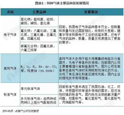 目前,從應用領域劃分,特種氣體主要有電子氣體、高純氣體、標準氣體三種,具體品種及發(fā)展情況如下。