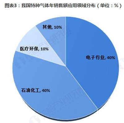 據相關數據統(tǒng)計,目前,在我國特種氣體年銷售額中,電子行業(yè)約占40%,石油化工約占40%;醫(yī)療環(huán)保約占10%,其它約占10%。