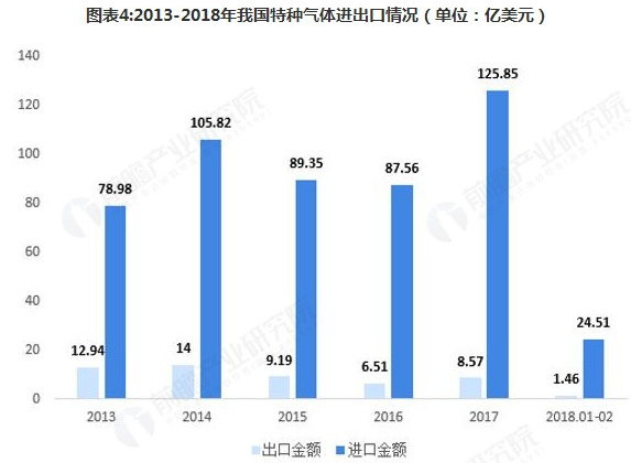 從特種氣體進出口金額來看,我國特種氣體主要以進口為主,進口金額遠遠超過出口金額,截止2018年2月,我國特種氣體進出口金額分別為24.51億美元、1.46億美元。