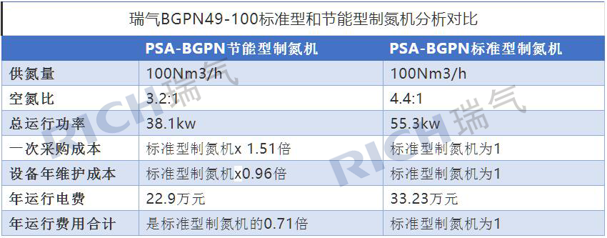 下面以瑞氣所生產(chǎn)的純度為99.99%的節(jié)能型制氮機(jī)為例,和標(biāo)準(zhǔn)型制氮機(jī)的參數(shù)進(jìn)行對(duì)比及分析。