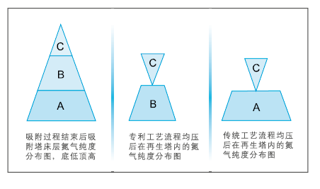 該流程對(duì)傳統(tǒng)工藝流程下均壓位置作了改進(jìn)。提高了氮?dú)饣厥章屎吞挤肿雍Y利用率,降低了能耗,改變了利用變壓吸附不能制取高純氮?dú)?99.9995%N2)的歷史。