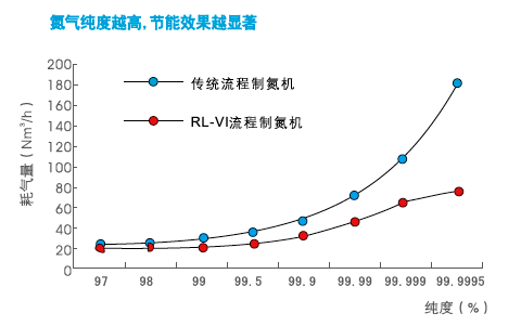 降低原料空氣消耗,確保吸附塔床層氮氣純度分布連續(xù)性,提高碳分子篩的產(chǎn)氮效率,改變了利用變壓吸附技術不能制取高純氮氣(99.9995%)的歷史。減輕壓縮空氣凈化單元負載,提高原料壓縮空氣預處理效果,確保碳分子篩性能指標。氮氣純度越高,節(jié)能效果越明顯。