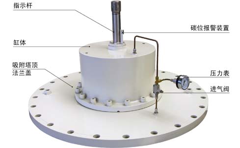 新型獨創(chuàng)的氣缸壓緊裝置,儀表氣直接取之于吸附塔,任何狀態(tài)下,氣缸內(nèi)壓力始終為吸附塔的最高壓力,不受吸附塔內(nèi)壓力變化的影響,確保分子篩始終處于被壓緊狀態(tài)。壓緊裝置中設置了限位沉降式報警系統(tǒng),當氣缸活塞行程達到下限行程時,設備控制系統(tǒng)自動產(chǎn)生聲光報警;當氣缸活塞到達極限行程時,設備自動停機,等待檢修。本氣缸具有方便檢測,可靠性強等優(yōu)點。